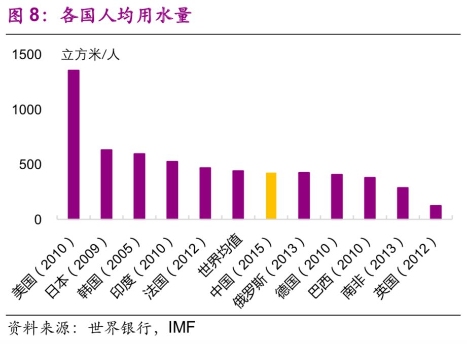 在用電與用水方面,中國(guó)的人均水平仍然較低,與人均GDP水平相適應(yīng)。中國(guó)人均用電量和人均用水量分別為3927千瓦時(shí)/人(2014年數(shù)據(jù))、425立方米/人(2015年數(shù)據(jù)),與世界平均水平(3966千瓦時(shí)/人、442立方米/人)大致相近,也與中國(guó)的人均GDP水平相適應(yīng),是美國(guó)(12984千瓦時(shí)/人、1357立方米/人)的30.2%、31.4%(圖7、8)。