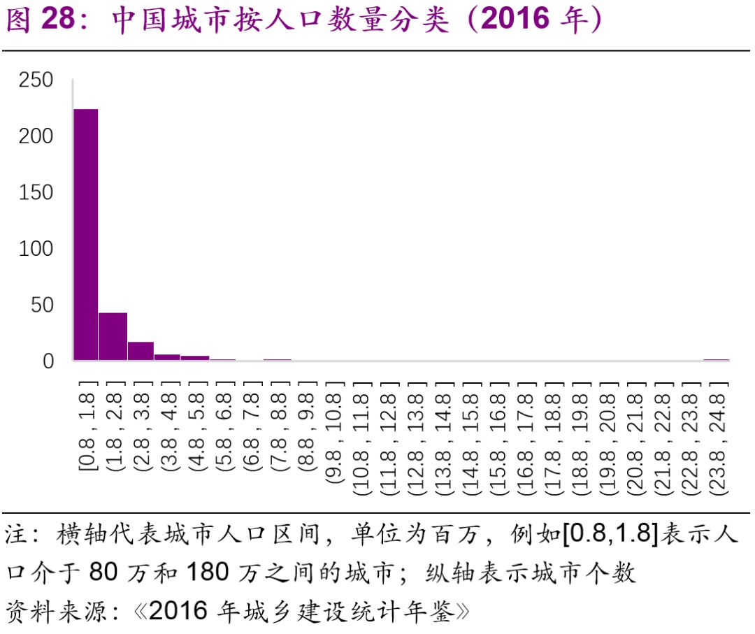擬建地鐵、輕軌線路初期客運(yùn)強(qiáng)度分別不低于每日每公里0.7萬人次、0.4萬人次,遠(yuǎn)期客流規(guī)模分別達(dá)到單向高峰小時(shí)3萬人次以上、1萬人次以上。但是同時(shí)也強(qiáng)調(diào)了:“以上申報(bào)條件將根據(jù)經(jīng)濟(jì)社會(huì)發(fā)展情況按程序適時(shí)調(diào)整?!?016年,中國(guó)城市中市區(qū)常住人口在150萬以上的城市共有111個(gè),對(duì)比目前已經(jīng)開通軌道交通的城市數(shù)量(34個(gè)),仍有一定的發(fā)展空間。而從國(guó)際上看,建設(shè)軌道交通的城市人口的起點(diǎn)[19]大約為100萬(圖27),如果長(zhǎng)期內(nèi)中國(guó)將建設(shè)軌道交通的人口標(biāo)準(zhǔn)下調(diào)至100萬,那么將有225個(gè)城市符合標(biāo)準(zhǔn)(圖28)。