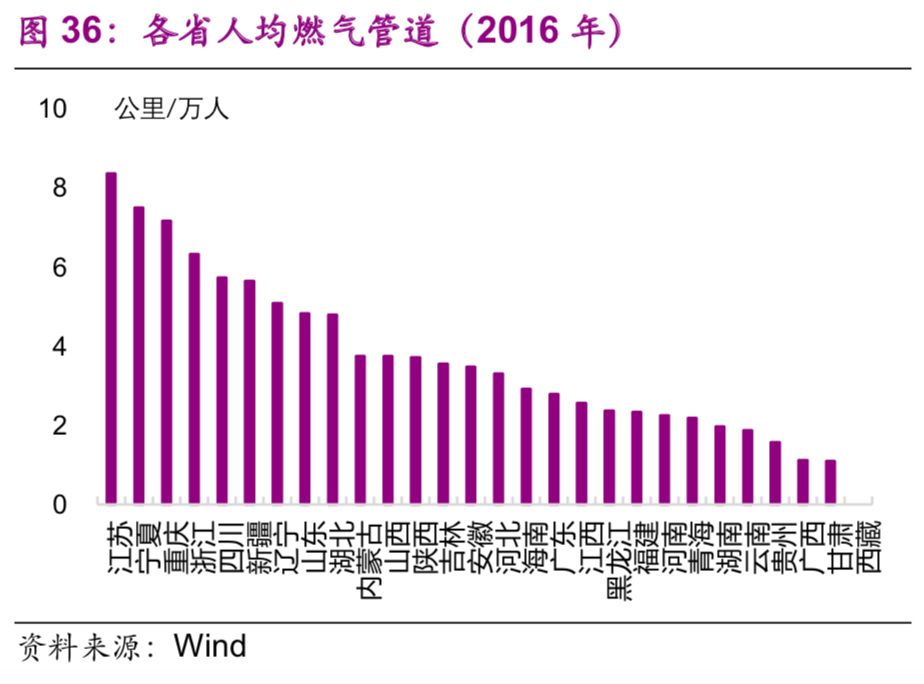 能源基礎(chǔ)設(shè)施方面,東部地區(qū)普遍高于中西部地區(qū)。2016年,燃?xì)夤艿烂芏扰琶叭氖墙K(0.65公里/平方公里)、浙江(0.35公里/平方公里)、山東(0.31公里/平方公里)(圖35);人均燃?xì)夤艿繹22]排名前三的也是浙江(8.4公里/萬人)、寧夏(7.5公里/萬人)、重慶(7.2公里/萬人)(圖36)。