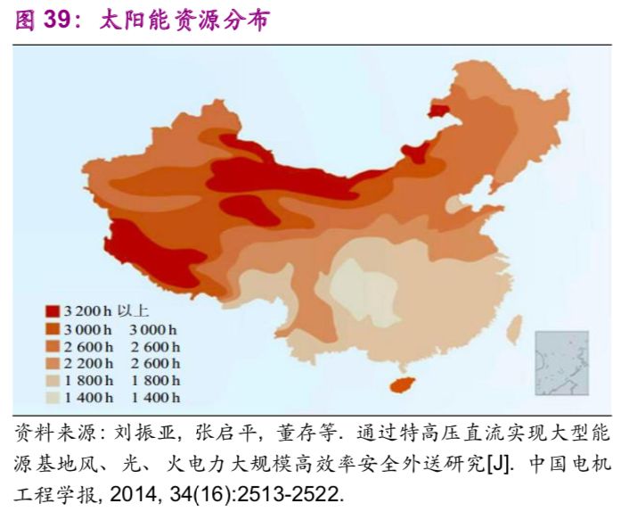 中國(guó)能源資源在地區(qū)之間的不平衡分布帶來了跨地區(qū)之間的能源輸送需求,例如“西電東送”“西氣東輸”。以水力資源為例,中國(guó)西部12個(gè)省的水力資源約占全國(guó)總量的81.46%,特別是西南地區(qū)的云、貴、川、渝、藏5個(gè)省占全國(guó)總量的66.70%。風(fēng)能、太陽(yáng)能同樣呈現(xiàn)西部多于東部的現(xiàn)象(圖38、39)。