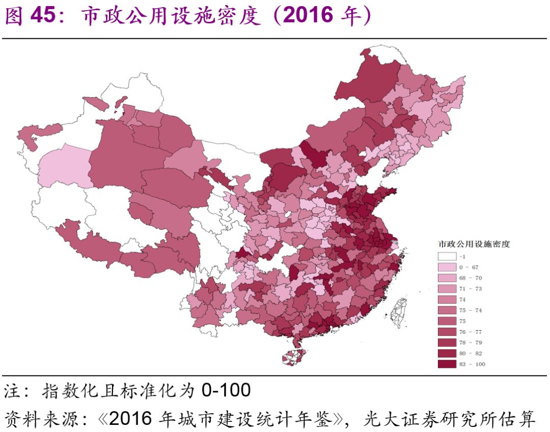城市市政公用設(shè)施投資結(jié)構(gòu)不斷變化。隨著中國(guó)城鎮(zhèn)化的不斷推進(jìn),2016年投資額達(dá)1.7萬億元的城市市政公用設(shè)施投資結(jié)構(gòu)有了較大變化:1990年占據(jù)較大比重的燃?xì)猓?6%)、供水(20%)隨著滲透率觸及“天花板[26]”后比重下降較快,兩者2016年的比重分別為2%、3%;而更能體現(xiàn)城市功能升級(jí)的公共交通、道路橋梁等的比重上升較快,1990年兩者的比重分別為8%、26%,2016年則分別為23%、43%;此外,許多新型的城市市政公用設(shè)施投資開始出現(xiàn),例如地下綜合管廊,2016年占比達(dá)到了1.7%(圖44)。